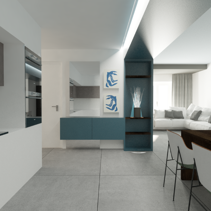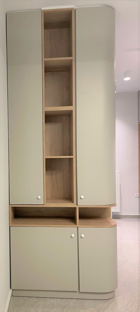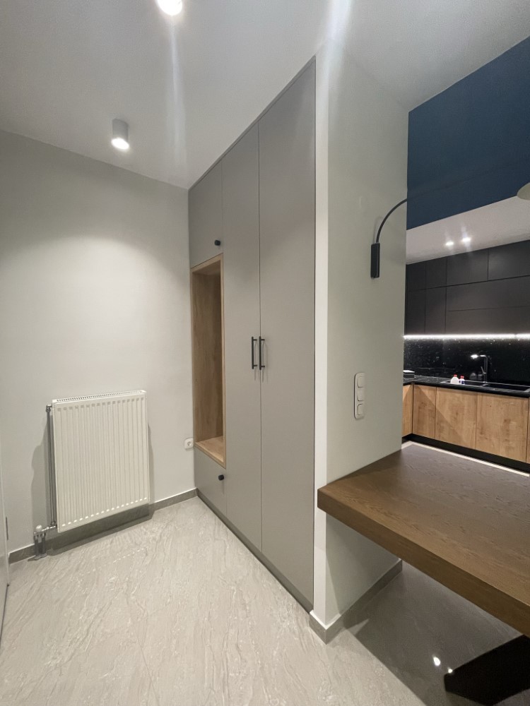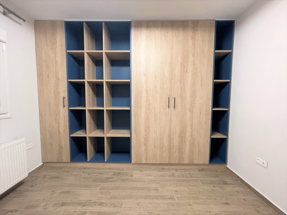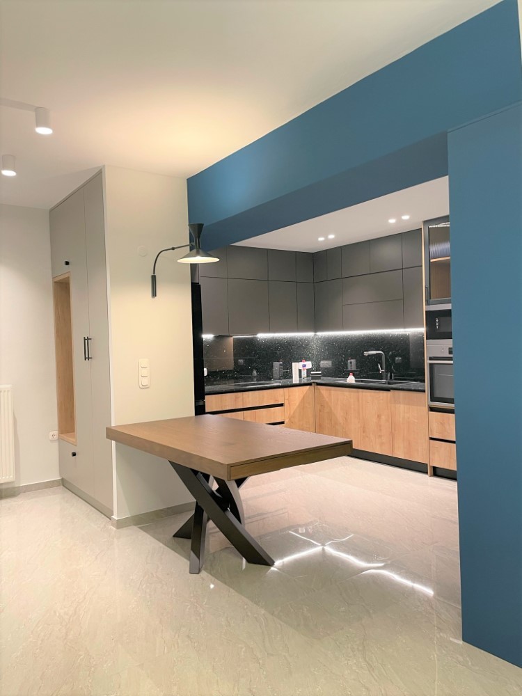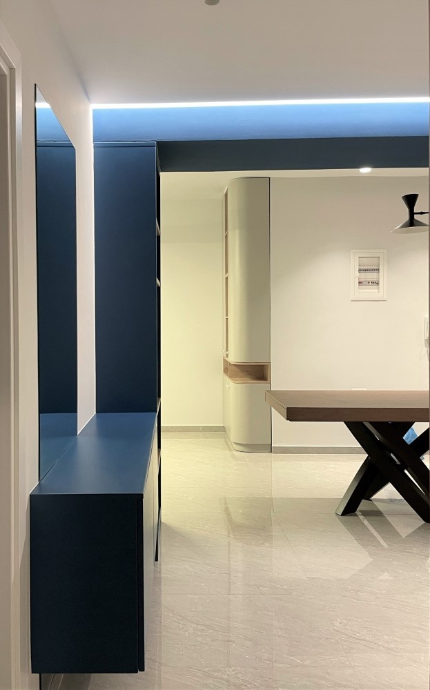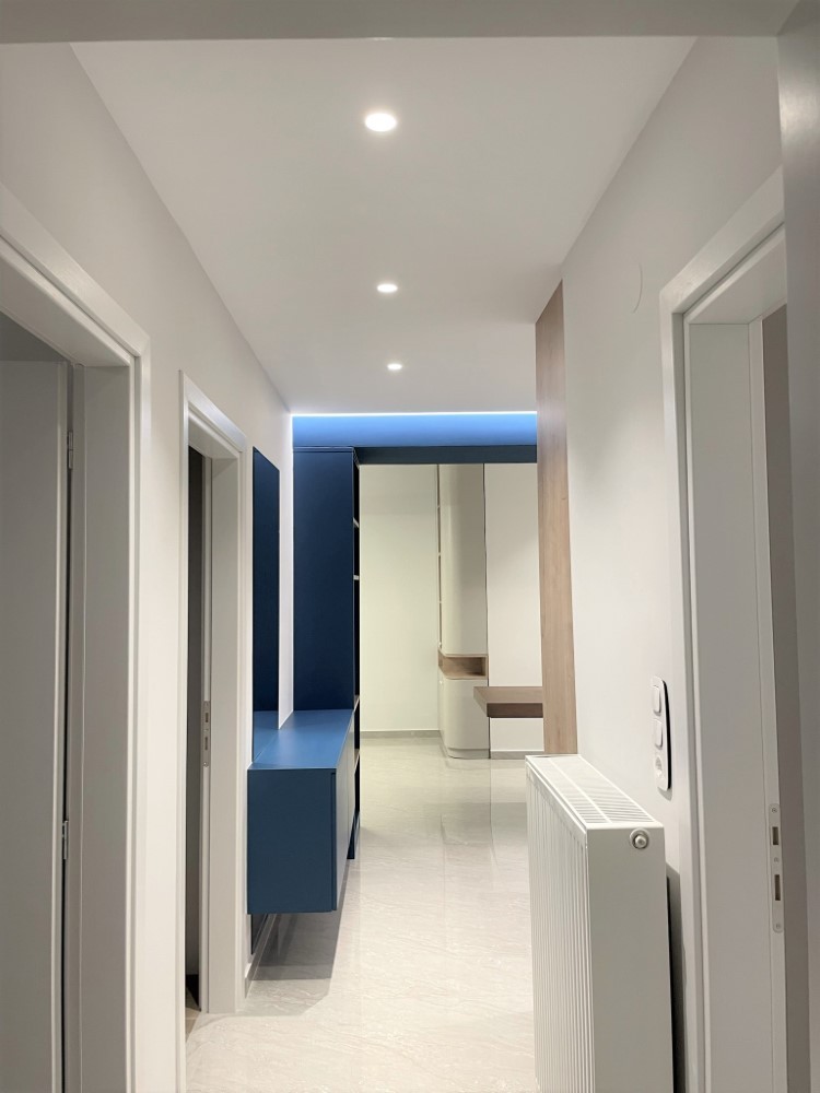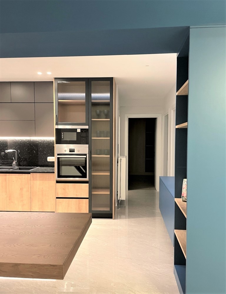 Ριζική ανακαίνιση πραγματοποιήθηκε για ένα διαμέρισμα στα Γρεβενά όπου δημιουργήθηκαν εκ νέου τρία υπνοδωμάτια και ένα ενιαίος χώρος σαλοκουζίνας. Όλα τα έπιπλα είναι ειδικά σχεδιασμένα για τις ανάγκες των ιδιοκτητών και εναρμονίζονται απόλυτα με τον περιβάλλον τους. Οι ψυχροί τόνοι του μπλε και των πράσινων πλακιδίων στο μπάνιο, ήρθαν να εξισορροπήσουν και να δώσουν μια πιο παιχνιδιάρικη διάθεση στο χώρο.